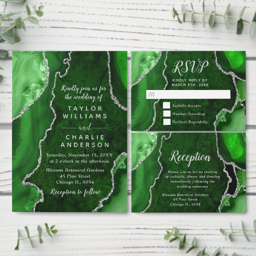 Make a bold and elegant statement with this green and silver agate marble wedding reception card. Featuring rich jewel-toned emerald hues, organic stone textures, and shimmering silver accents, this design beautifully complements a luxurious wedding celebration. Perfect for formal, modern, or glamorous events, the dramatic contrast of green and metallic silver sets the tone for an evening of cocktails, dinner, and dancing. Fully customizable with your reception details, this agate-inspired reception enclosure adds a refined and cohesive touch to your wedding stationery suite, ideal for fall or winter weddings.