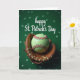 This greeting card shows a lime-green baseball with red stitching nestled snugly in a worn, honey-brown leather glove at the center, like a close embrace between old friends. Behind them, a deep emerald background is dotted with soft, out-of-focus light spots in lighter greens that read like clovers drifting through the air ☘️. The lighting falls gently across the glove’s creases and seams, giving the leather a cozy, lived-in look while the ball keeps a smooth, slightly glowing finish 💚. Near the top, the phrase “happy St. Patrick’s Day” appears in white, flowing lettering, spaced so it sits clearly above the glove and ball. The bright ball against the darker green backdrop creates a strong contrast, and the red stitches echo the warm tones in the glove. The scene feels like a shared celebration where the equipment seems to lean into each other, inviting a quiet moment between teammates or sweethearts. The background shifts subtly from darker green at the edges to a lighter green haze near the center, with scattered clover-like light circles surrounding the main image.