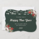 Elegant green New Year card featuring a watercolor painting of poinsettia, holly and red berries along with string lights. Easily personalize online.