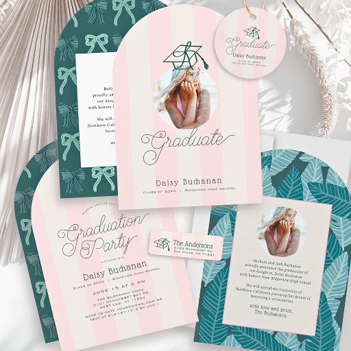 Green Cap Pink Stripes Bow Graduation Announcement Inbjudningar