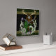 This striking Celtic-inspired artwork features a majestic forest god, Cernunnos or Green Man adorned with antlers and intricate blue face markings. Cloaked in deep green, he holds a wooden staff surrounded by elegant vines, purple flowers, and Celtic knotwork designs. The ornate border frames the image beautifully, creating a timeless piece that celebrates nature, mythology, and ancient Celtic art. Perfect for fantasy lovers, druids, and those who appreciate mystical and pagan themes.