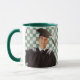 Personalized men's portrait mug for a graduation with a green checkered pattern on the background and the class, the graduate's name, degree, university name, and a grad cap design on the back. To create a cut-out, crop your image to the desired subject and use the "remove background" tool.