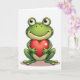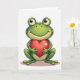 This greeting card shows a friendly cartoon frog standing in the center of a plain white background, holding a shiny red heart close to its chest ❤️. The frog is shaded in green, with darker green on its arms and legs and a lighter green belly, plus a few uneven brown spots. It has a big, happy smile and wide eyes with dark pupils and small white highlights that make it look sweet and sincere. The heart looks glossy, with light reflections that make it feel like a special gift 💌. A soft pinkish shadow under the frog adds a bit of depth while keeping the setting simple. There isn’t any printed text on the card, so the frog and heart are the full message. Share it with someone you care about and pass along warm Valentine’s Day feelings 🍫.