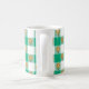 Adorable, whimsical green and white gingham pattern mug with cute yellow sunflowers with happy faces in each of the light green squares.