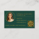 Promote your law firm or attorney services with this elegant green and gold business card featuring a photo layout and scannable QR code for easy contact sharing. The clean, professional design conveys trust and prestige while maintaining a modern edge. Perfect for lawyers, legal consultants, and firms seeking a refined, print-ready presentation.