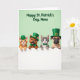 This card shows four cozy animal friends—two cats and two dogs—peeking over a bright white ledge against a pale green background, their heads close together like they’re sharing a private joke 💚. A ginger kitten wears a small green hat, while a fluffy brown dog and a wrinkled-faced dog wear taller green hats with tiny gold buckle details, and a grey-and-white tabby stays bare-headed for contrast. Green bow ties on the brown dog and the grey-and-white tabby add a sweet touch, as if they dressed up to match for someone special ☘️. Their expressions tell the story: the kitten looks wide-eyed and curious, the brown dog grins with an open mouth, the tabby gazes calmly with blue eyes, and the wrinkled-faced dog looks quietly watchful. The gentle lighting softens their fur and makes the greens feel fresh without being harsh. Centered above the group, dark green text reads “Happy St. Patrick’s Day, Nana,” sitting neatly in the open space of the background. The letters are smooth and slightly slanted, floating above the four faces like a header. The pale green backdrop stays uncluttered, with the white ledge forming a straight horizontal line beneath their chins.