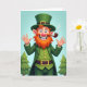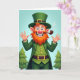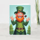 This card shows a cheerful leprechaun centered on a soft teal background, smiling wide beneath a thick orange-red beard that fills much of the lower half of the scene. He wears a tall green hat with a gold buckle, along with a matching green coat and vest dotted with small golden buttons that catch the light. His bright eyes and rosy nose give him an inviting, friendly look, like he’s greeting someone he’s glad to see 💚. Both hands are lifted in welcome, and a dark pipe rests near his mouth with thin white curls of smoke drifting upward. Behind him, two softly blurred green trees sit off to the sides, suggesting a quiet outdoor setting without pulling focus from his face. The lighting adds gentle depth to the folds of his clothing and the texture of his beard, making the figure stand out clearly. There is no text on the front, leaving the teal space open while the green trees and a small curl of smoke form a loose frame around him ☘️.