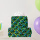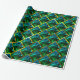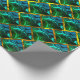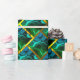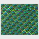 Traces and green curves with alterations of shades that may seem emerald, with lines stained in yellow and gold colors that simulate splices. The colors of the lines around the squares can cause a perception of gold metallic ribbons, or some sort of grid over green. The green of the squares change from a dark shade at the top to the lightest at the bottom, this effect added to the contrast of the lines can cause the illusion that the squares are a bulky cloth trapped in a grid or mesh; depending on the position you observe, ambient lighting or personal perception.