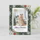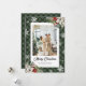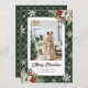 Beautiful green plaid photo Christmas card featuring snowflakes and winter botanicals including white poinsettia, holly and red berries against a green buffalo plaid background.
