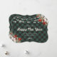 Elegant green buffalo plaid New Year card featuring a watercolor painting of poinsettia, holly and red berries along with string lights on a green and black buffalo plaid background. Easily personalize online.