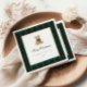 Green plaid patterned Christmas napkin design with a cute teddy bear illustration.