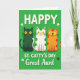 Designed with three stylized cats lined up side by side on an emerald green background, this St. Patrick’s Day scene feels like a friendly group photo with a hint of cozy closeness 💚. The left cat is deep forest green with darker spots, the middle cat is white with lime green polka dots, and the right cat is warm orange with small cherry red speckles. Their wide yellow eyes and little upturned smiles give the impression they’re sharing a private joke, leaning into each other with easy companionship. Small white shamrocks are scattered around them like confetti, adding a classic holiday touch ☘️. The word “HAPPY” appears in white at the top, centered above the cats. Along the bottom, white text reads “ST. CATTY’S DAY Great Aunt,” stretching across the lower area beneath their faces. The overall look stays flat and graphic with bright, even lighting, and the white shamrocks dot the green space around the trio.
