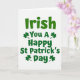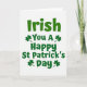 This card features a minimalist St. Patrick’s Day design with stacked emerald-green lettering centered on a bright white background. The main phrase reads “Irish You A Happy St Patrick’s Day,” arranged in a neat vertical layout that feels like a friendly toast shared between close friends 💚. “Irish” sits at the top in the largest letters, drawing the eye first, while the rest of the words step down beneath it in slightly smaller type. The rounded letter shapes keep the look soft and welcoming, like an easy smile across a table. Small shamrock icons ☘️ appear as simple accents around the wording, adding a gentle nod to tradition without crowding the space. The text stays centrally aligned with generous white space around it, giving the message room to breathe. A few stylized three-leaf clovers punctuate the composition near the lines of text, matching the same green tone against the white field.