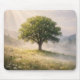 A solitary tree stands in the center of a misty field, bathed in warm sunlight under a partially cloudy sky that enhances the peaceful ambiance