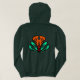 "A stylish women's pullover hoodie featuring a vibrant orange and green abstract pattern on a deep forest green base. Comfortable, unique, and perfect for adding an artistic touch to your streetwear."