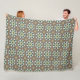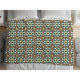 Towel and washcloth with intricate circular patterns in green, white, and brown on a hanging rack and surface, creating a decorative and cohesive look.