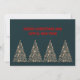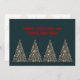 Greeting wish card Merry Christmas and Happy New Year written in English in red font with golden Christmas trees with balls and stars on a green background - editable text and background