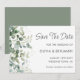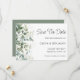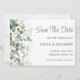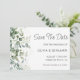 Anpassade bröllop spara datum-kort med eukalyptus grey gräns på en vit bakgrund.