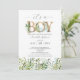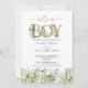 Denna vackra pojkbabyvisa inbjudan har grönt eukalyptus löv med beröring av grönt och guld typografi. Matchningsartiklar finns i Greenery Eucalyptus Rosa Det är en Boy Shower-samling.