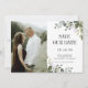 Elegant greenery Photo on Back Save the Date Card with water color eucalyptus lövs and soft botanical foliage. Den här klassens utformning är perfekt för vår eller sommar-bröllop. Den har en modern palett för grönt. Ett tidlöst val för par som kärlek naturverk, romantiskt och bladinspirerat bröllop. Koordinerar perfekt med matchande inbjudningar och OSA kort från samma samling.