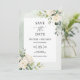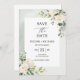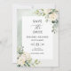 Det här är ett vackert trendig Spara datumkortet med grönt löv, och färsk eukalyptus med vit ros-vår blommor-accenterad kalligraftissettering i finare. Sälj fullt med den här designen.
