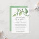 Rustic par babyduschinbjudan med en enkel design med en vattenfärg målad grön spirg med stora löv, över en vit bakgrund. Nedan visas händelseinformationen i ett mjukt grått och baksidan har en ljust grönt vattenfärg tvättat. Denna botaniska elegant är könsneutral och fungerar för en pojke eller flicka.