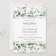 Snyggt moderna skandinaviska stil-inbjudningar till skogsbröllop. Med lövgiga löv av lövgrönt löveukalyptus, på ren vit bakgrund.