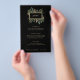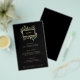 These stunning Christmas wedding menu cards feature holiday greenery and leaves with faux gold leaves and red holly berries, and a center gold frame on a modern black background. These menus also work perfectly for any holiday party.