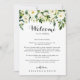 Denna grönaktiga vita blommigt bröllop välkomnar brev är perfekt för ett rustiskt bröllop. Konstruktionen har vattenfärgade vita peonier med elegant med gröntens löv. Anpassa fronten med ett välkomstmeddelande till dina gäster och till namn. Anpassa baksidan med schemat för händelser och annan användbar information.