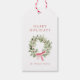 Watercolor Greenery Wreath & Red Bow Happy Holidays Gift Tag. Personalize with your greeting and name.