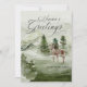 En fredlig vinterscen visar gräs träd, berg och hjort. Säsongens Greetings skrivs ovan i en traditionell och klassisk manustext. Med en anpassningsrad i högerna i grund kan du lägga till ditt namn eller ett annat hälsning.