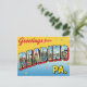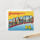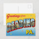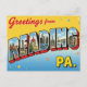 Celebrate Reading, Pennsylvania, with this incredibly fun and uniquely designed "Greetings from" vintage postcard! This classic large-letter style card features the city name in bold script over a bright yellow and blue background. Inside the letters, you'll find a delightful and often humorous mix of famous world landmarks—a quirky feature common to these mid-century souvenir designs! Spot iconic images that look like they belong in Paris, New York, or San Francisco, all framed under the name of Reading, PA.