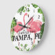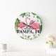 Greetings from Tampa, FL, pink flamingos and palm tree leaves.