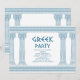 Elegant grekisk eller romersk toga födelsedagsfest inbjudan med eleganta tempelpelare och grekiskt meander mönster i blått. Anpassningsbar produkt för en minnesvärd firande. Perfekt för bröllop, förlovningar, examensfester, årsdagar, save the dates, möhippor och födelsedagsfester.