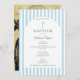 En vacker baptismdesign med en modern båge med dammig blå Kor och strimmig bakgrund och en grekisk-ortodox ikon av Jungfru Mary på baksidan av kortet. En religiösa som är perfekt för en pojke Baptism-Christening. Matchande papper och dekorfärg kan visas i den här designens samling.