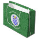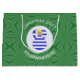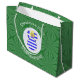 En stor presentväska har en ängel som bär Greklands flagga för dekorering av helgdag eller juldekoration. Julängen finns inuti en vit cirkelformad rektangel. Bakgrunden är en grönt som består av fyrkanter. Lägg till din egen text eller anpassa den med namn och året. ert grekiska arv i julhelg.