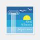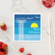 Grekiska spalter och fiskmåsar grekiskt badbröllop papper napkin med vit grekisk kolonn och havsfåglar på stiliserad bakgrund av flertonsblå band - marinblå, himlar blå, akva- och gult sol. Den moderna bröllop-mallskonstruktionen i elegant som är helt anpassade är perfekt för en grekisk eller grekisk strand sommar bröllop. Den ingår i en samling eller uppsättning av bröllop.
