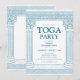 Elegant födelsedagsinbjudan till Toga-fest inspirerad av antikens Grekland i blått med kolonner och sten-element. Perfekt för ditt evenemang med tema Antikens Grekland eller Antikens Rom!