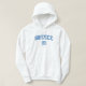 " Grekland" typ- och medborgareflagga i en ren stil. Ord GREKLAND är fastställdt i en college- stilstilsort i en båge över en avbilda av den grekiska flagga. Flagga av Grekland (som ses populärt till som den blåvita "himmlen" eller "det blåvitt"), officiellt igenkänd av Grekland som ett av dess medborgaresymboler, baseras på nio jämlikehorisontalrandar av blått som växlar med vit. Det finns en blåttcanton i övrehissa-siden tränga någon att uthärda en vitkor; kor symboliserar östlig ortodox kristendomen, den etablerade religionen av det grekiska folket av Grekland och Cypern. Enligt en populär tradition symboliserar de nio randarna de nio musorna, gudinnorna av konst och civilisation