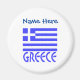 Rund magnet visar den grekiska flaggan och ordet, GREKLAND, nedan i blått. Flaggan visar blå och vita ränder med ett blått och vitt kors i det övre högra området. Ovanför det, lägg till ditt namn, också i blå bokstäver, för en personlig touch eller skapa en skräddarsydd present. Bra för att fira Oxi-dagen.