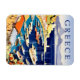 Greklands magnet. Båtar i hamnen och liten marknad på strandpromenaden vid havet. Vintage resor poster på en magnet.