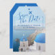 Ett resetagg formade Greklands turistbröllop sparar datumet med Santorini Blue Church Byggnad och moderna manusskript med en romantisk flygplansikon med hjärta. Du kan lägga till ett eget målbröllopsfoto i bakgrunden och ändra texten färger så att den matchar ditt foto eller bröllop färg tema.