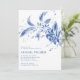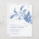 Denna verkligt utsökta bröllop inbjudningskort för möhippan har en vacker blå och vit eterisk blommigt arrangemang som fokuspunkt på överdelen. Den ömtåliga och fina utformningen är perfekten för ett oförglömligt firande. Baksidan av inbjudan innehåller ditt initialer i ram tillsammans med en vit blommigt elegant mot en blå bakgrund.