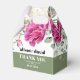 Den här bröllopsaffären visar vackra eukalyptus grenar som är förskönade med ömtåliga rosa ros-blommor och lush greenery. Parets namn är elegant markerat i fet typografi, vilket gör utformningen personlig. Dessutom finns det ett uppriktigt "Tack"-budskap som man tänker ta upp och som uttrycker en uppriktig uppskattning till gästerna för deras närvaro denna speciella dag. För att förbättra den totala estetiska bilden placeras ett band för grönt av chic grund i lådan, vilket utesluter en känsla av sofistikering och kompletterar utseendet perfekt.