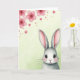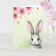 This card features a soft, painterly scene with a fluffy rabbit-like character in the lower right, turning its head as if meeting someone’s gaze with a tender, friendly look 🐰. Its fur is a gentle grey, with tall ears lined in warm pink that echo the small pink nose and faint rosy cheeks. Dark brown eyes with fine lashes add a sweet, affectionate expression, like it’s quietly sharing a moment with you. The background is a pale lime green wash that feels like early spring light, keeping the focus on the character and the drifting details. From the upper left, clusters of soft pink blossoms spill diagonally across the space, with loose petals floating down as if carried by a mild breeze 🌷. Tiny golden dots are sprinkled among the petals, giving the air a soft sparkle without overpowering the scene. There is no visible text on the front, leaving the open green space to frame the falling flowers and the rabbit’s upward glance. The blossoms gather most densely near the top left corner, thinning into scattered petals and gold specks as they drift toward the rabbit’s ears.