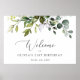 Lägg till en personlig beröring till födelsedagsfirandet med den här snyggten och de minnesvärda party-objekten! Designfunktionerna är eukalyptus löv och grön på vit bakgrund.
