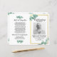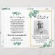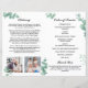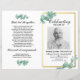 [All text är EDITABLE] Kostnadsmässigt anpassat Dubbla, omsättningsbart program med ett foto på framsidan och två foton på insidan. Tema: Greenery Eucalyptus Löv. Stil: Elegant och Lugn. Gender: Unisex. Färg: Grönt, Vita, Faux Guld. Grafik: Watercolor hand plockade eucalyptus löv, faux guld ramar.