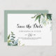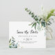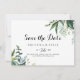 Det gröna tropiska kalligrafiområdet bröllop spara datum är perfekt för ett enkelt bröllop. Konstruktionen har främst tropiska löv av grönt med ett litet stycke blommor av rosa som är väl placerade i elegantens vågor och geometriska former.