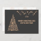 Greeting wish card Merry Christmas and Happy New Year written in English in gold font with Christmas balls and tree on a grey background - editable text and background