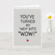 This greeting card centers on the message, “YOU’VE TURNED MY ‘MEH’ INTO ‘WOW!’” with the words set in black, simple block-style letters that feel a bit like casual handwriting. The text sits right in the middle inside a light gray rectangle, making it the main focus. Just under “WOW!” there’s a small red heart that stands out as the brightest spot on the card ❤️. Around the gray center panel, a wide off-white border frames everything nicely. Scattered across that border are many tiny pale blue hearts, spaced out in a loose, easy pattern. The overall look is sweet and straightforward, with the red heart adding a clear note of affection 💌. It’s a great pick for someone who makes your day better, and it pairs perfectly with a little treat like 🍫. Wishing you a happy Valentine’s Day and hoping you share your feelings with someone special.